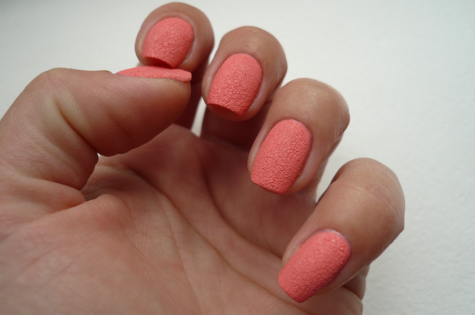 Запах слабовыраженный лаковый. Ногтевую пластину не окрашивает, вообще очень удобно наносится с помощью средней по толщине кисти. Высыхает быстро, оба слоя высохли за 15-20 мин. без использования каких-либо сушек. Носится долго, три дня, затем появились сколы. Цвет, на мой взгляд, коралл, чуть матовый, но на солнышке песчинки начинают чуть поблескивать, такое ощущение, что немного глянца в нем все-таки есть.